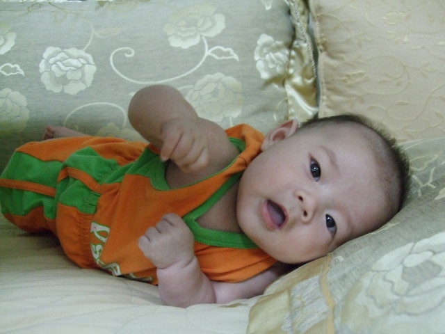 當然啦,四個月大的小森森一樣愛笑,而且也很愛講火星文~有時候可以對著媽咪演講好久的火星文...然後媽咪就得要很配合的用火星文跟他對話,講到他口渴,然後又討ㄋㄟ喝....= ="
