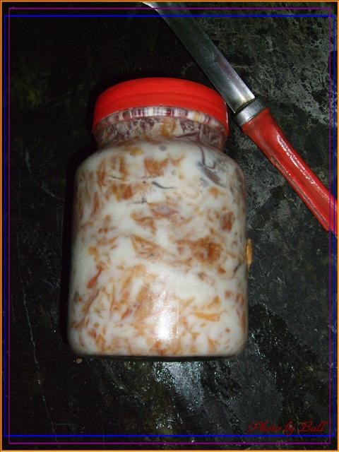 拿出這罐,我娘自己炒的油蔥,就是把紅蔥頭用豬油炸成酥,冰入冰箱,然後就變成這樣...