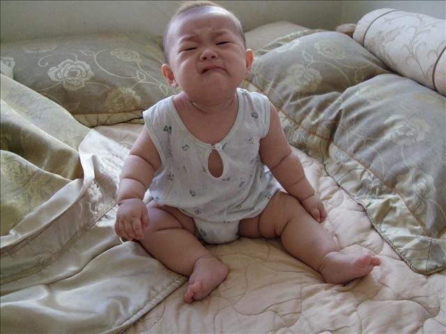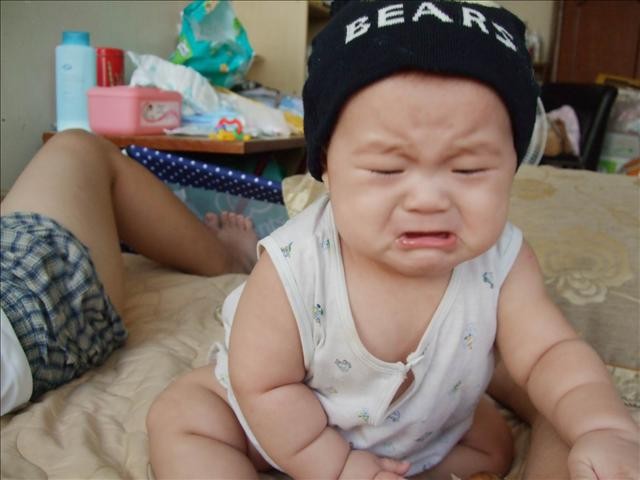 然後這傢伙一副很可憐的趴在我身上又是扁嘴又是嗚嗚叫的哭,沒良心的娘親又繼續告訴他,有哭就好了,哭太久會吵到隔壁鄰居,然後這傢伙開始很委屈的不哭改扁嘴…..