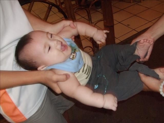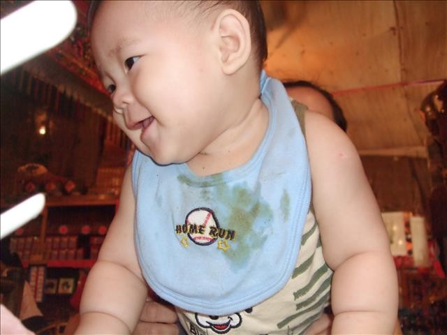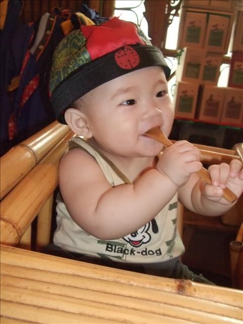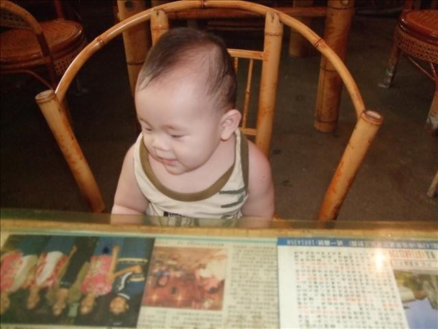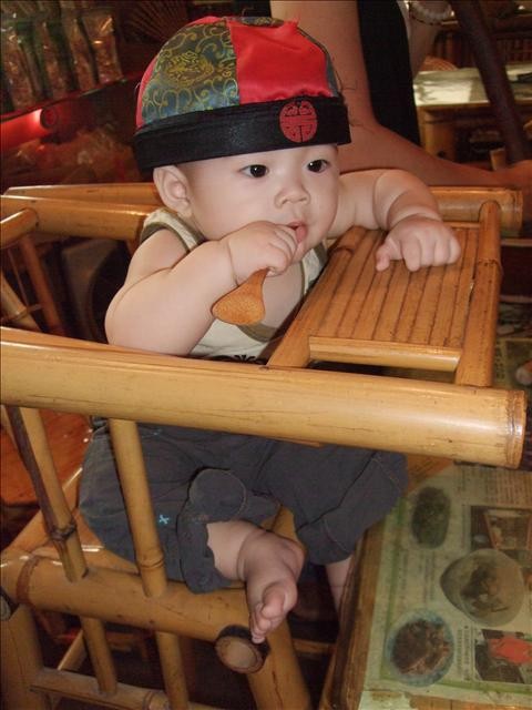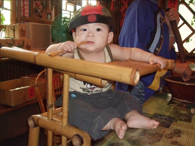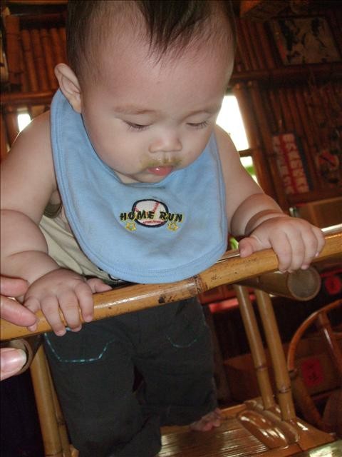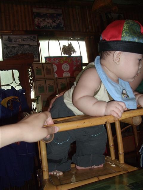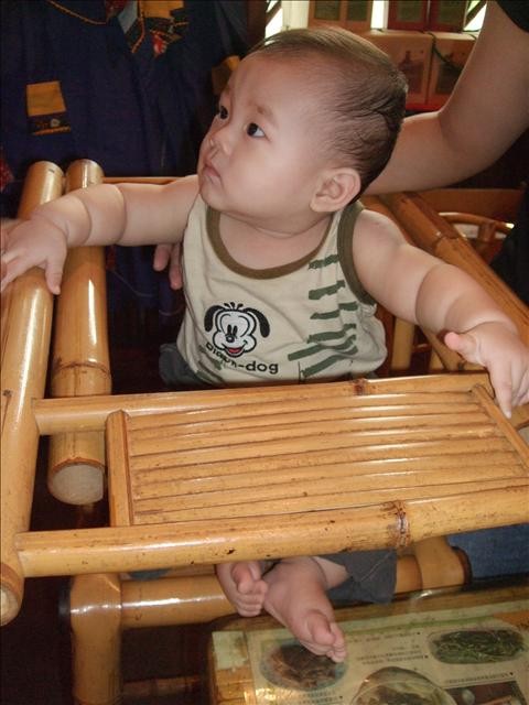 喔喔,小森森的嬰兒椅來了…竹製的嬰兒椅,很有味道呢!蠻高的,剛好讓他的腳放在桌子上,嘟嘟好,避免會滑下去!