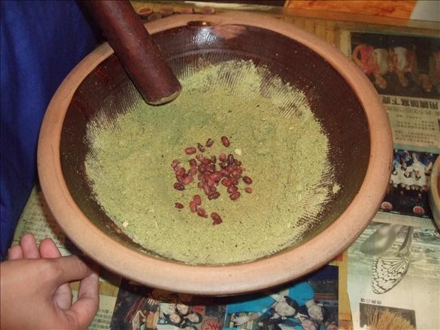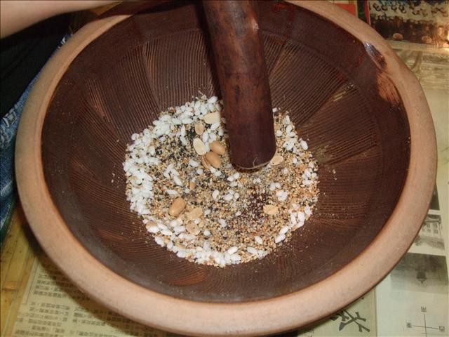 加入其他的擂茶粉磨一下之後再加入紅豆繼續磨~