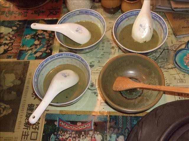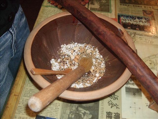 擂茶的工具,就是這樣啦,擂茶缽、研磨棒、一支刷子還有一個小刮杓,刷子是要刷掉擂茶缽上的擂茶粉,小刮杓….其實它在這邊沒啥作用,因為都被小森森拿去當固齒器了~哈哈!!!