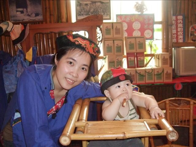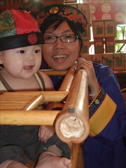 這家擂茶館的特色就是他有「免費」提供一些客家傳統服飾讓你穿戴,可惜都是大人的衣服,好不容易找到一個size比較小,可以適合小森森戴的東西….
