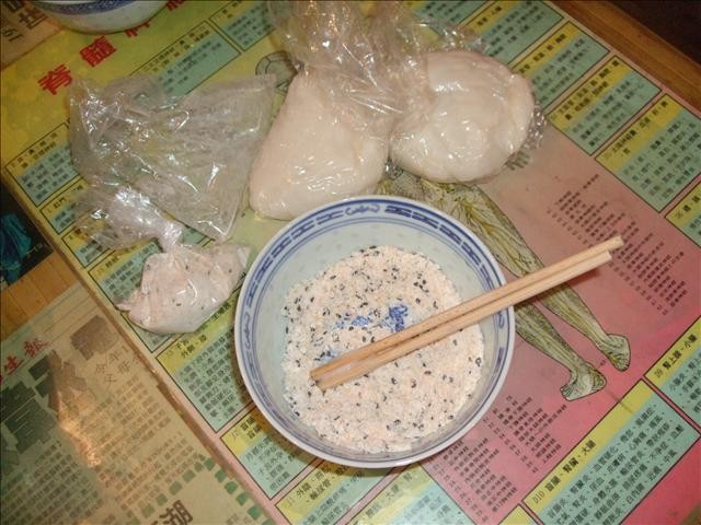 我拿的兩包麻薯,這是傳統的糯米擣成泥後在自己用筷子捲一小團沾芝麻糖粉吃,他們做的麻薯很好吃呢!自己捲麻薯不僅可以沾糖粉吃,還可以沾擂茶粉吃喔!別有一番風味呢!