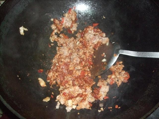 二、辣椒醬稍微炒了一下之後把絞肉丟進去炒。
