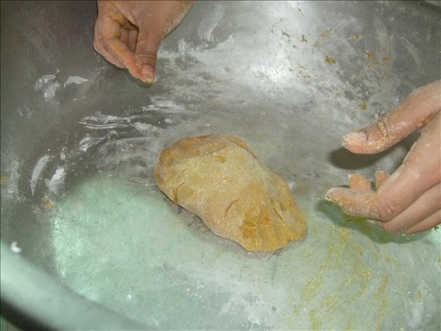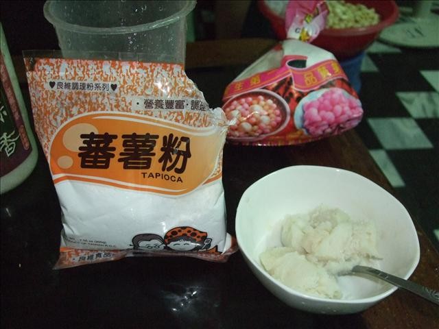 二、再加入地瓜粉攪拌,地瓜粉的量依地瓜的量來調整,要慢慢的加入粉攪拌,攪拌到地瓜團不濕為止,這不是揉麵團,不用揉到很有嚼勁,只要揉到麵團不濕就可以了。我買的那顆地瓜大概是一個手掌大小,所以用去了大半包的地瓜粉,大約150g有吧!歹勢,我家沒有磅秤,沒得量…
