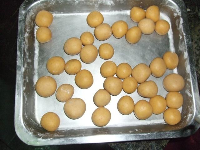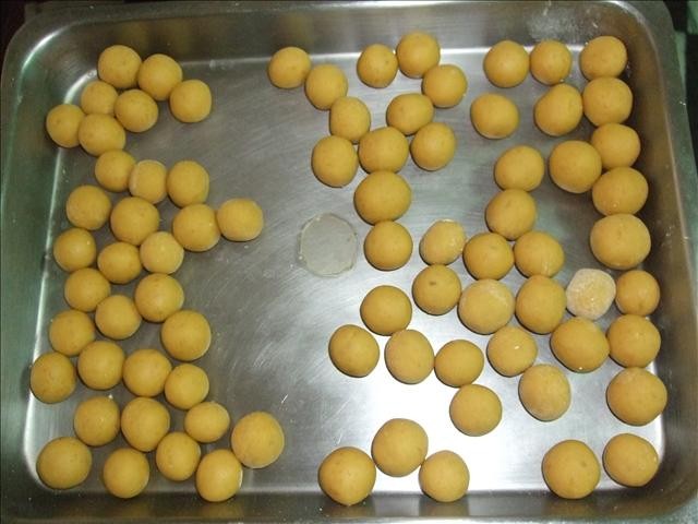 五、有帶小孩的,為了怕丸子搓完後不能馬上炸,可以在盤底鋪一點糯米粉讓他滾動一下,避免丸子跟盤子相親相愛太久,等到要炸的時候拔不開….
