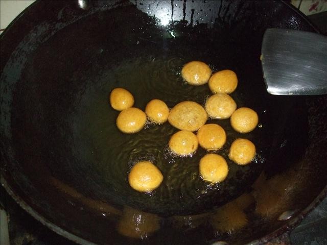 八、下鍋之後要一直翻,避免黏在一起!翻了大約半分鐘後,請拿著鍋鏟或是杓子反覆的壓地瓜球!不要怕地瓜球會破掉,要把地瓜球內的空氣壓出來,這樣地瓜球才會膨脹中空變成QQ好吃的地瓜球!一直壓就會慢慢變大!就像這樣↓