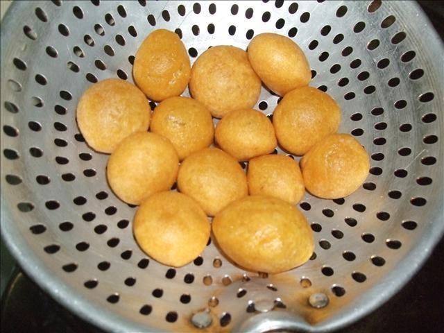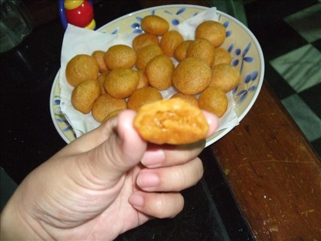 第三次,就真的是正確的地瓜球了,只有地瓜泥跟地瓜粉攪拌,炸出黃金如夜市般地瓜球~我出頭天了!