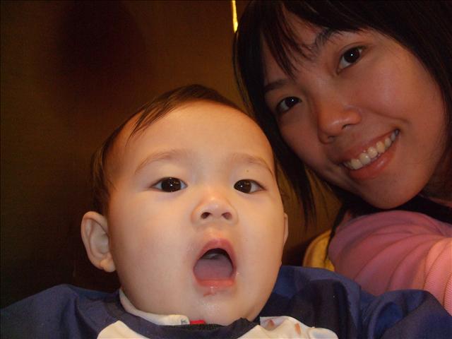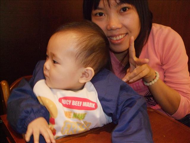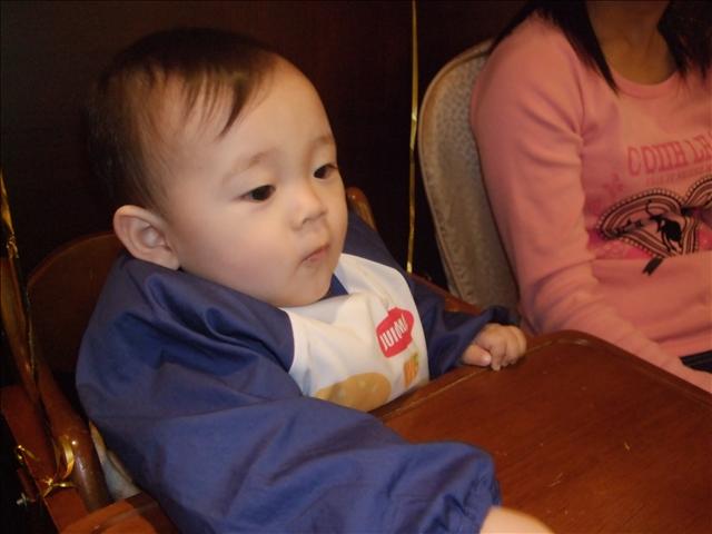 話說在喜宴當天,一進到會場內,我就叫服務生幫我換一個兒童餐椅來,準備把小胖森綁住!小森森一坐在椅子上就馬上轉向旁邊跟我妹求救←沒辦法,這傢伙知道他媽不會救他的….