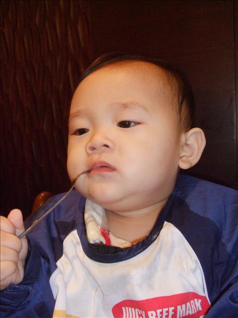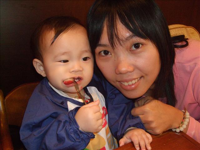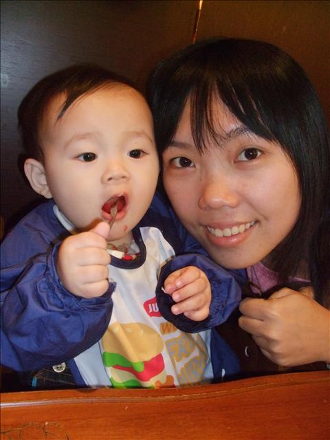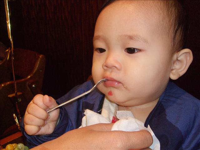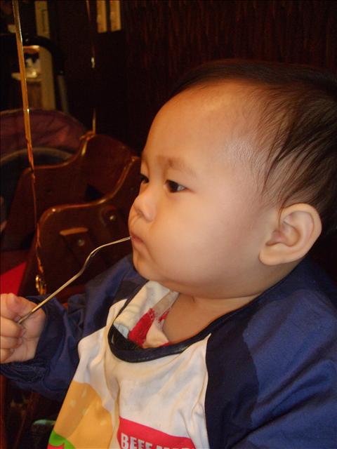 叫服務生幫我送一副兒童餐具來→其實最主要的目的是要給他玩的啦!小森森拿著碗玩的可開心的咧….