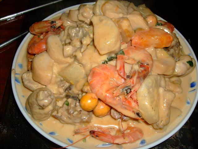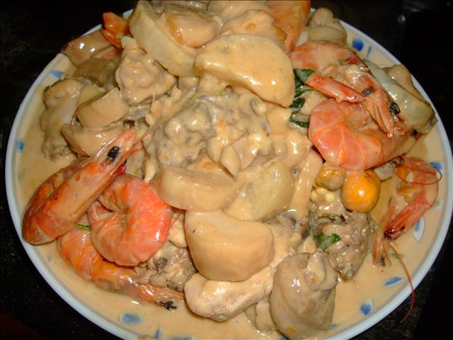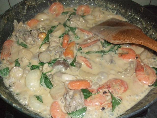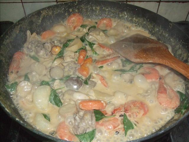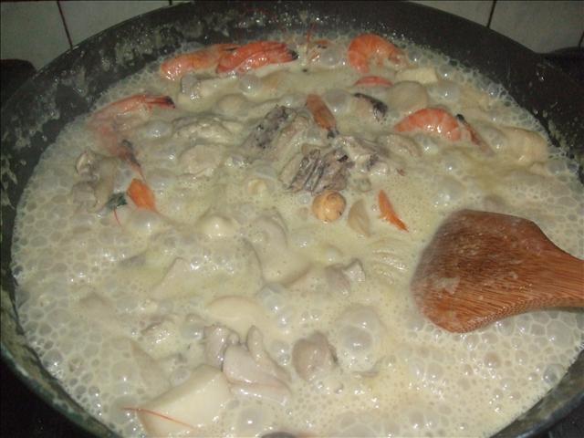 臨時發現冰箱冷凍內有蝦子,於是洗了幾隻蝦子丟下鍋一起滾咖哩椰漿!