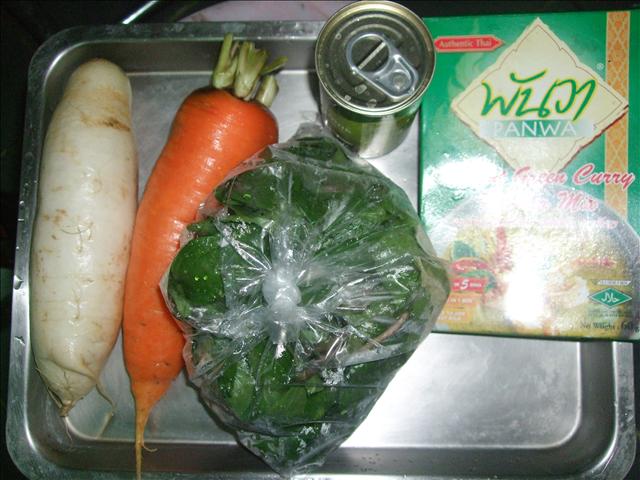 紅、白蘿蔔各半條切塊,165ml椰奶一罐、牛奶一小罐,九層塔一包,家樂福買的綠咖哩粉一盒!
