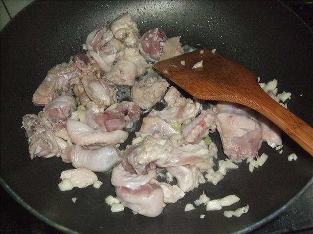 起鍋將蒜頭小小爆香後加入雞肉熱炒一番。(其實可以不用加蒜頭,蒜頭純屬各人喜好)