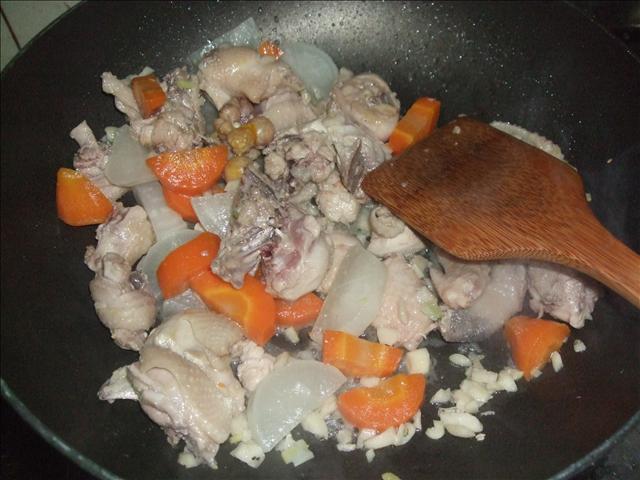 大略炒出雞肉香味後加入蘿蔔塊繼續熱炒。