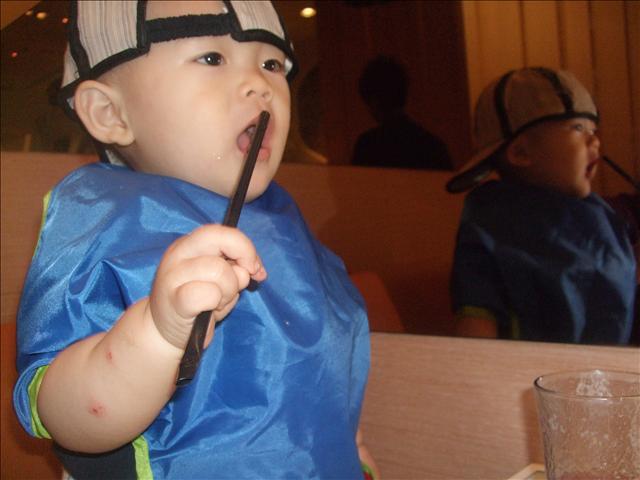 在閒聊育兒經的時候,森森跑去找隔壁桌的少爺玩!隔壁桌的小孩也很開心的跟森森握手示好….同齡的小孩子果然是特別有吸引力….