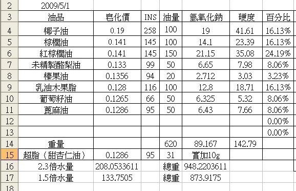這次用的配方是參考同事給我他們社區手工皂教學的配方,他們社區教學的油並沒有用得比我的,我則是用我手上有的油下去做調整!