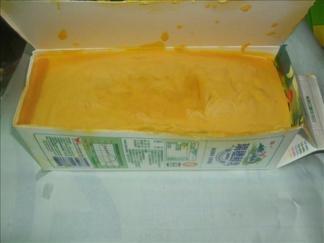 有了前幾次的經驗,千容前輩說,我攪拌的太認真了!她都沒喇到像我這樣,於是這次我在攪拌的時候,給他青菜喇一下,用電動攪拌器喇了十幾分鐘就入模收工了!這次是拿牛奶盒來當模子!