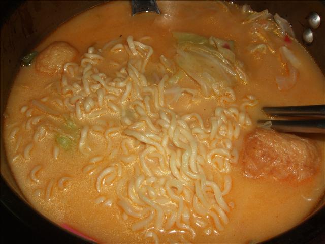 煮了一大鍋熱水,先用一半的水燙了一下麵本身去掉乾燥劑的氣味,剩下的一半拿來煮湯!湯頭用一堆高麗菜跟半顆洋蔥,還有三顆花枝丸跟幾顆魚餃丟進去!起鍋前再打各蛋,這樣吃的時候就可以吃到流有蛋汁的滑嫩香蛋囉!