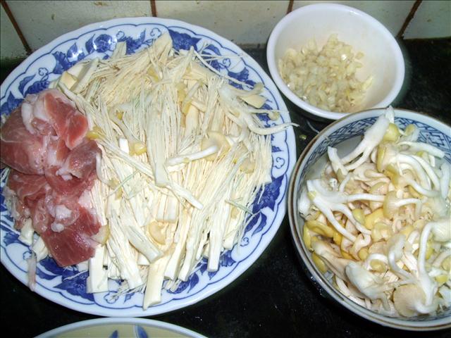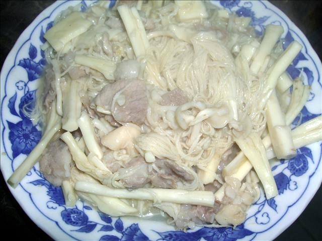 三、豬肉炒到五分熟後,加入半天筍跟養生菇稍微翻炒後加入半碗水蓋鍋蓋,悶三分鐘後打開鍋蓋調味後加入少許太白粉水勾芡即可上桌。