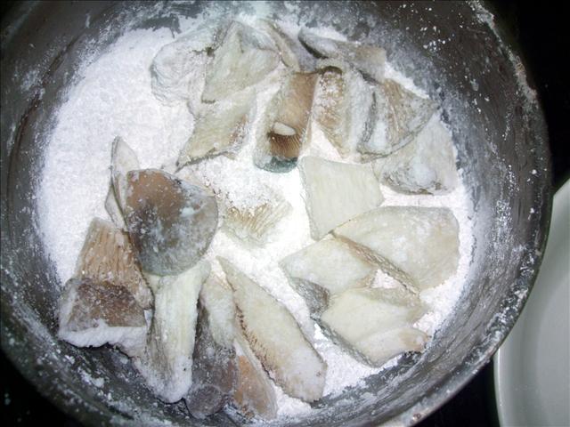 鹹酥雞的作法很簡單,把菇類切丁洗乾淨瀝乾之後裹地瓜粉,最好是用細的地瓜粉,這樣才不會覺得粉很厚!另外再準備三條旗魚黑輪切塊,不需要裹粉,放在旁邊瀝乾即可。最後鹹酥雞都一定要有的蒜末、蔥末跟九層塔,也是洗乾淨放在旁邊備用。