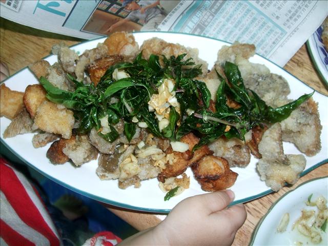 四、在炸第二次的同時,把九層塔、蒜末、蔥末放在濾網上往油鍋放,讓油淋幾次,就會出現入口及化的九層塔片啦!