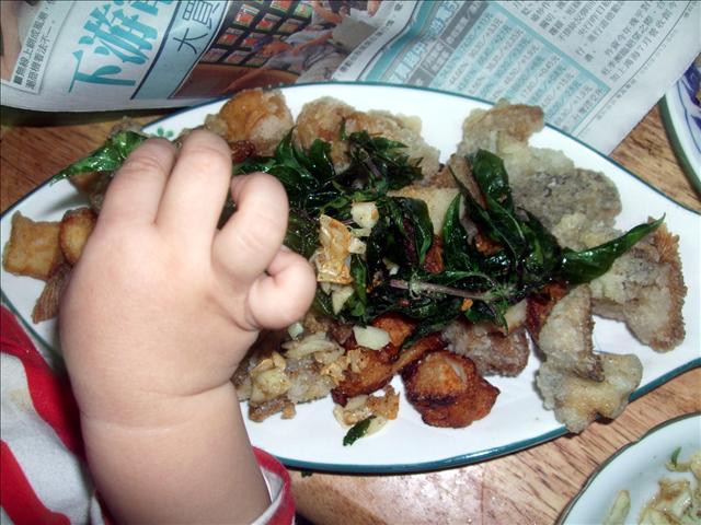 又迫不及待的用他肥嫩的小手捏了一顆想要偷吃,不過怕燙的他還是沒吃到!