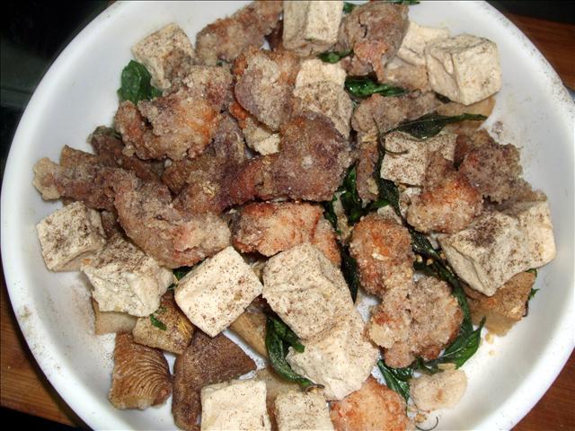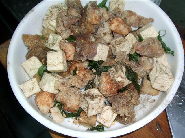 大約醃一小時候,把雞胸肉拿起來瀝乾,再裹上薄薄的地瓜粉,就可以下鍋炸囉!這次炸鹹酥雞,還有百頁豆腐、袖珍菇一起炸,雞胸肉實在是太大片了,一塊百頁豆腐還有一把袖珍菇加上雞胸肉,竟然就炸出了一大盤!可見,鹹酥雞攤真好賺...