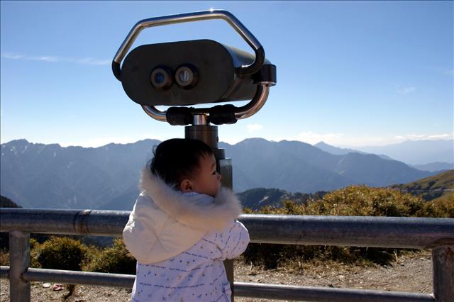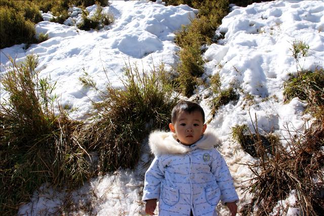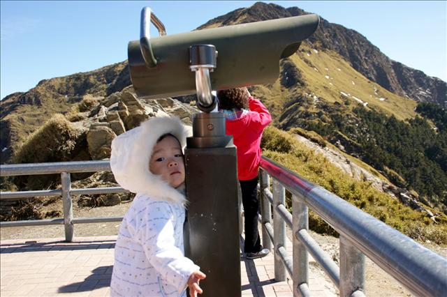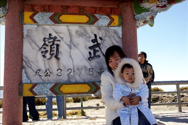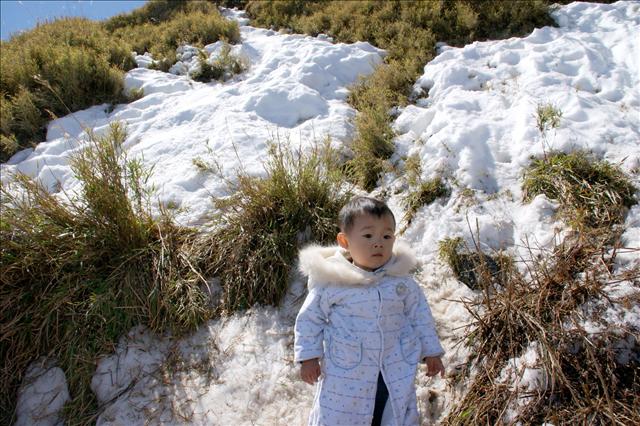 到了武嶺停車場,一下車,強烈的冷風馬上吹過來!快點拿出本來已經收好的羽絨大衣,再幫森森穿上他的長袍大衣!在民宿的時候感覺還蠻熱的,而且之前上網看都是說,白天在農場那邊其實日正當中,陽光很曬,不會太冷。也就沒幫森森帶帽子上來!當然也更沒想到要上山看雪,這下子森森才剛裡完頭的光溜溜後腦杓要是沒拿各東西遮蔽一下,武嶺的六級風可能會讓他很快就感冒!