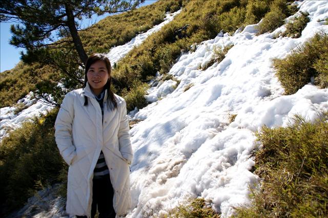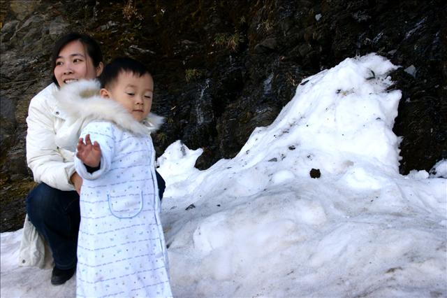 在武嶺待一下,就開往松雪樓了!在路上,又看到一片積雪,趁著沒啥人的時候又再度下車快點拍一拍~可惜森森不太配合,拍個照一直扭…= =”