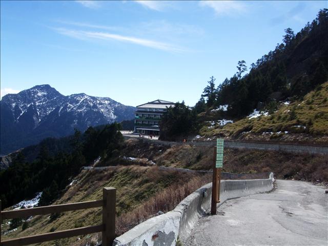 遠看松雪樓。松雪樓是全台灣最高的飯店,位於合歡山國家公園的入口處旁,在這裡,一年四季看到的景色就大概是兩種吧!不是松樹就是雪景~哈哈!所以才叫松雪樓吧!