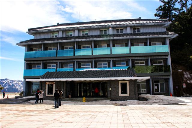 松雪樓的正面就像這樣,外面還有樓上的陽台主要都是以玻璃為主!我想要是用木材建料的話,應該很快就腐爛了吧!松雪樓側面的山坡以及背後的山坡有很明顯的一整片雪景,所以一堆遊客都跑去那邊拍照了!