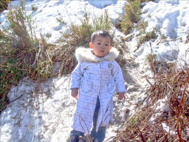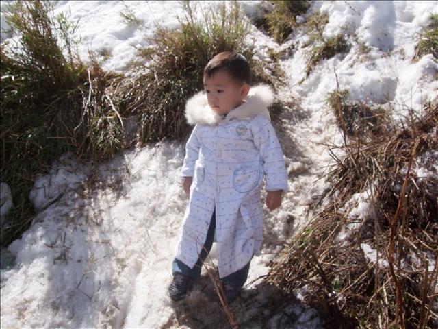 森森一個人站在雪地拍照有點怕怕的,想要自己走下來,可是雪地真的很滑,一不小心就會跌倒~