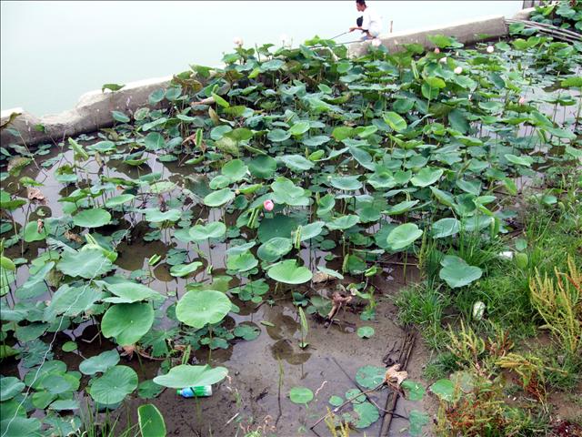 湖邊圍了一圈的蓮花,旁邊還有人釣魚咧!