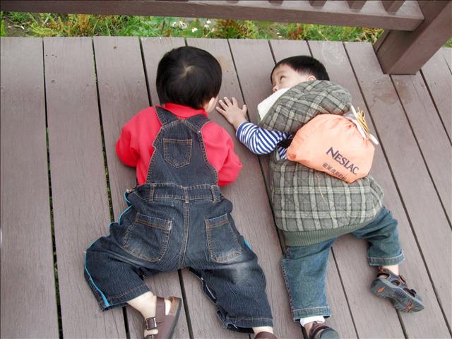 來寶很喜歡走到哪裡趴到哪裡,動作跟表情就像是間諜貼在地上仔細聽遠方的動向...所以森森也學著趴在地上當烏龜....