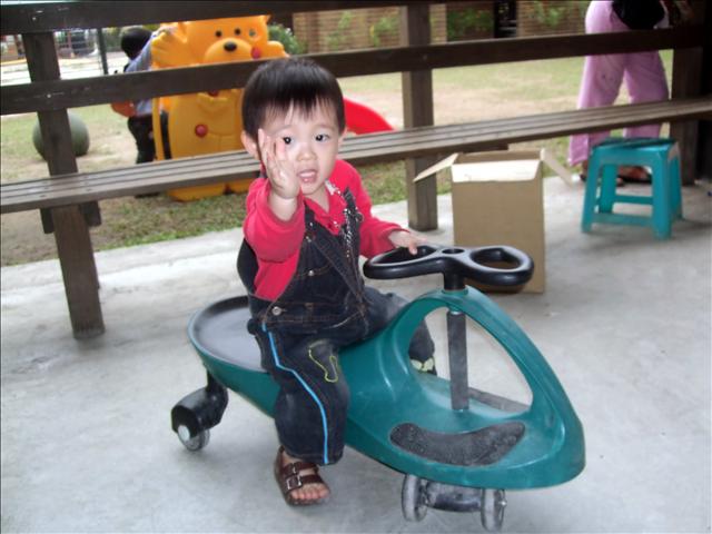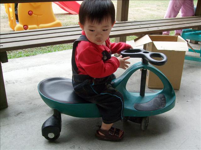 森森第一次看到扭扭車,不太會玩,我也坐了一台教他怎麼玩!好不容易玩了一陣子才上手!不然一開始還從車上翻下來,還好這傢伙沒啥痛感,不會哀!坐在車上對著我比「YA」←其實只會比五百....