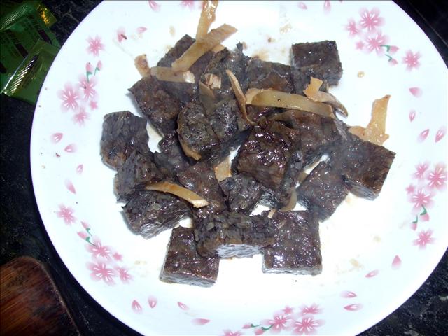 等到薑的香味出來之後,再把切塊的鵝米血丟進去悶炒到米血變軟香即可。