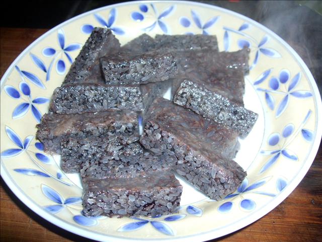 另一種作法就是很單純的把切塊的米血送進去電鍋蒸熱就可以了!冒著煙的燒燙米血啊。
