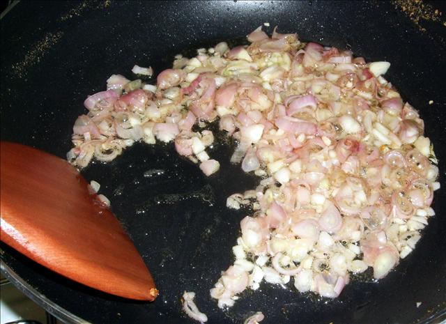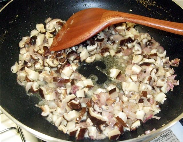 二、乾的香菇泡水,等到膨脹在切末。泡過的香菇水留著備用。等到紅蔥頭炒到軟之後,就把香菇末加入鍋子內炒香!