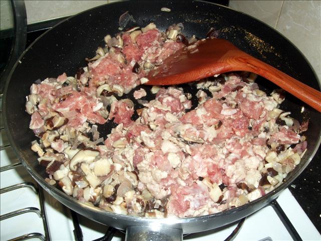 三、等到香菇末炒到有點乾之後就可以把絞肉丟進去炒囉!
