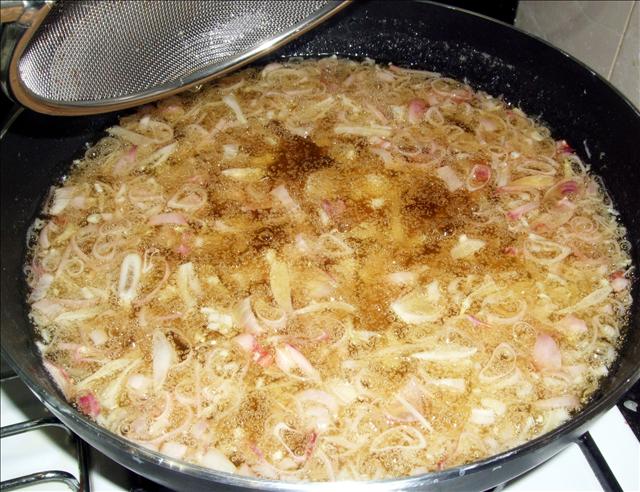 二、將鵝油倒入鍋內,等到中溫後,再把紅蔥頭倒入慢炸。要炸到金黃酥脆是需要一點時間的,請耐心慢慢炸。