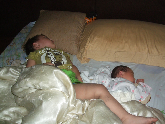 其實森森跟森二平常是隔開睡的,我是睡在他們兩個中間的,可是常常我爬起來之後,森一就會不自覺得滾到弟弟身邊了...然後,一下子不是手抱著弟弟睡,不然就是腳跨在弟弟身上.....