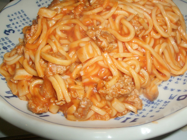 蒜頭爆香後下杏鮑菇丁、肉躁炒散,然後就可以下麵條(今天用的麵條是油麵),下了麵條後,再三湯匙的紅醬,再加點水,等到湯汁收乾後,下幾滴魚露就可以上桌囉。
