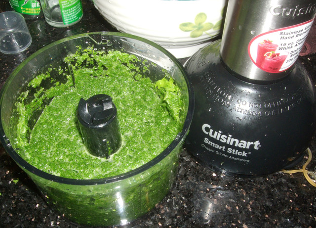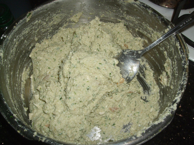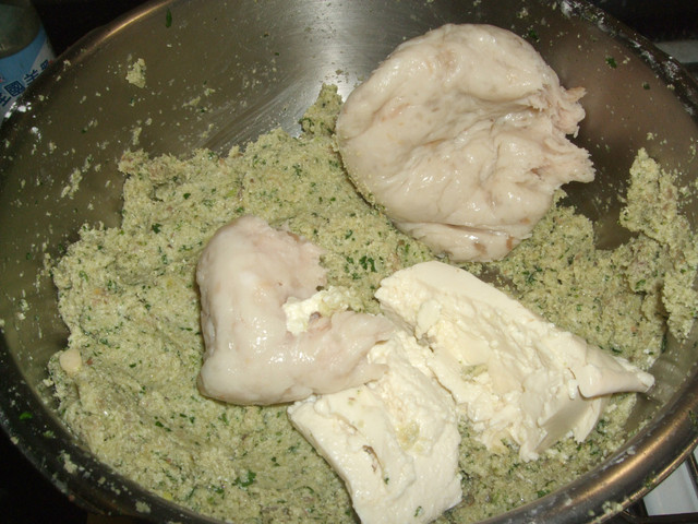 丟了一大把波菜、杏鮑菇及少許蒜頭打成泥,加入一大塊豆腐跟一些於漿,準備做成丸子。