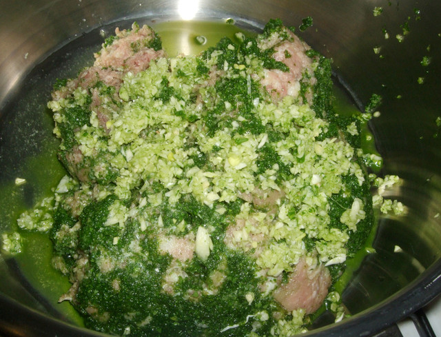 準備材料:蒜頭三瓣、菠菜一大棵、絞肉一大碗。