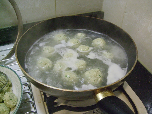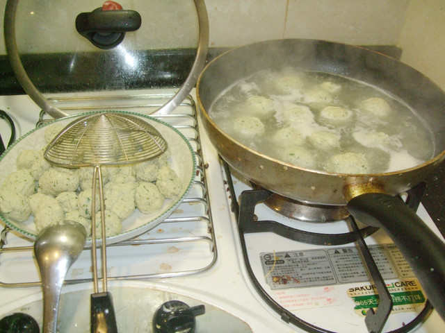 示範四:事先就要準備好的熱水,隨時丟丸子下鍋,才會成形。