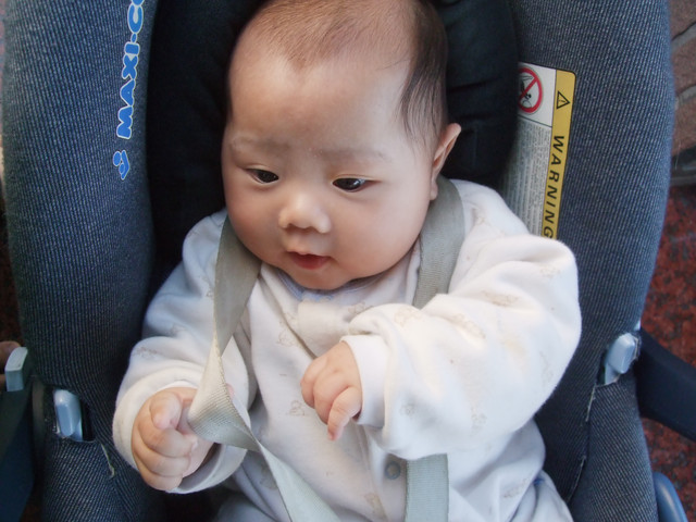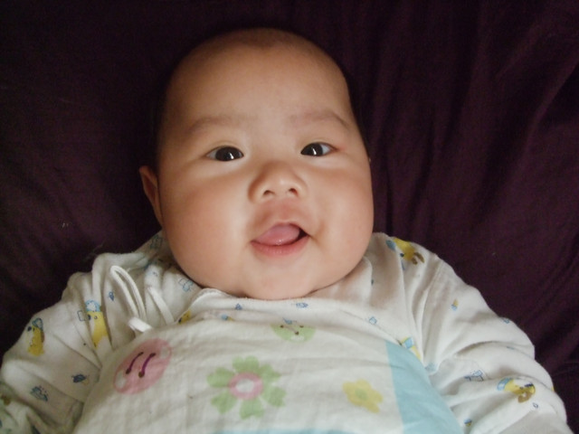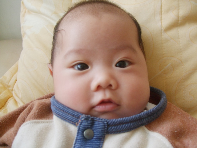 四個月的森二很「健壯」,比森一小時候更像米其林寶寶。非常的頭好壯壯,成長曲線,體重落在95%(以前森一最高只到75%),身高落在75%,大頭落在50%。體重...嗯...阿諾...就...8.5kg,是抱久了會扭到的重量....XD
