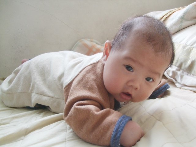 森二會翻身了,不過通常不太會「主動」翻,會翻身通常都是看到有目標出現(想要拿東西),或是被目標追著跑(被哥哥欺負)時,才會很快就翻過去。不然平常沒事,以他這種笨重的身體,他翻身是一件很累的事,不太隨便翻的!通常翻身過後趴完之後,再翻回來,就可以喝ㄋㄟ秒睡了...哈哈~~~