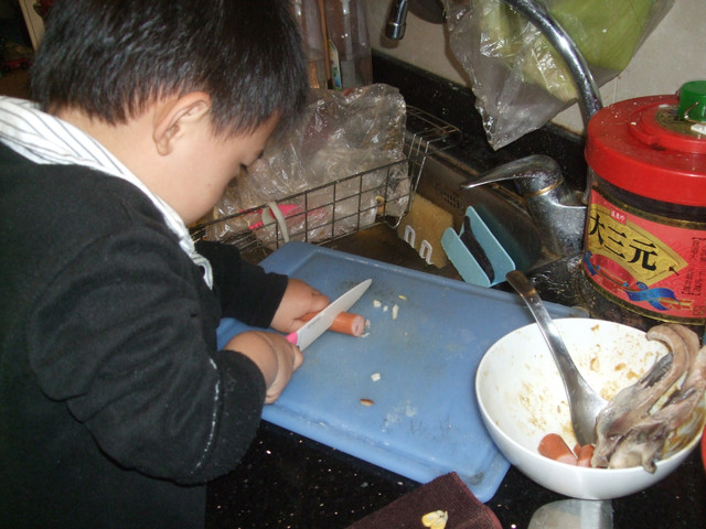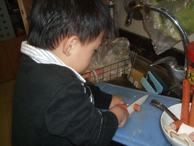 補一張森一的廚房小幫手照,正在切他喜歡吃的德國香腸.....