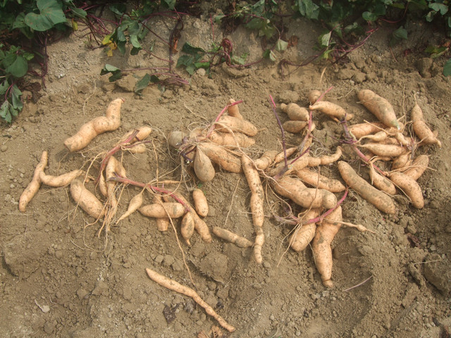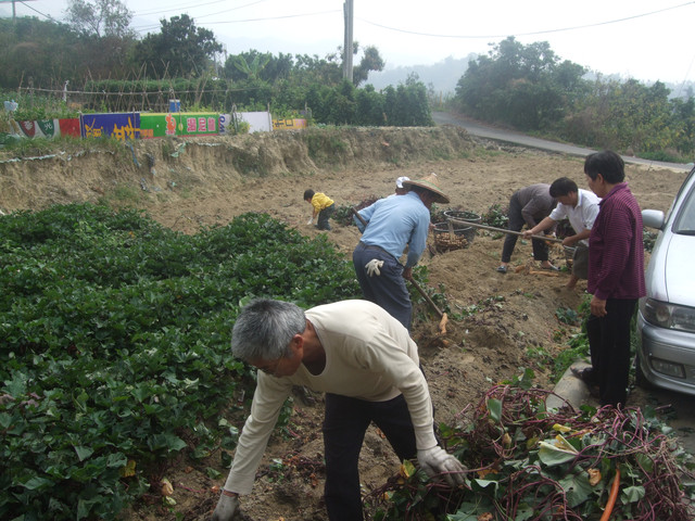 首先來介紹一下,地瓜是怎麼出土的?就是先把上面的地瓜葉先割掉!下圖中右下角的地瓜葉被割掉放在一旁囉!